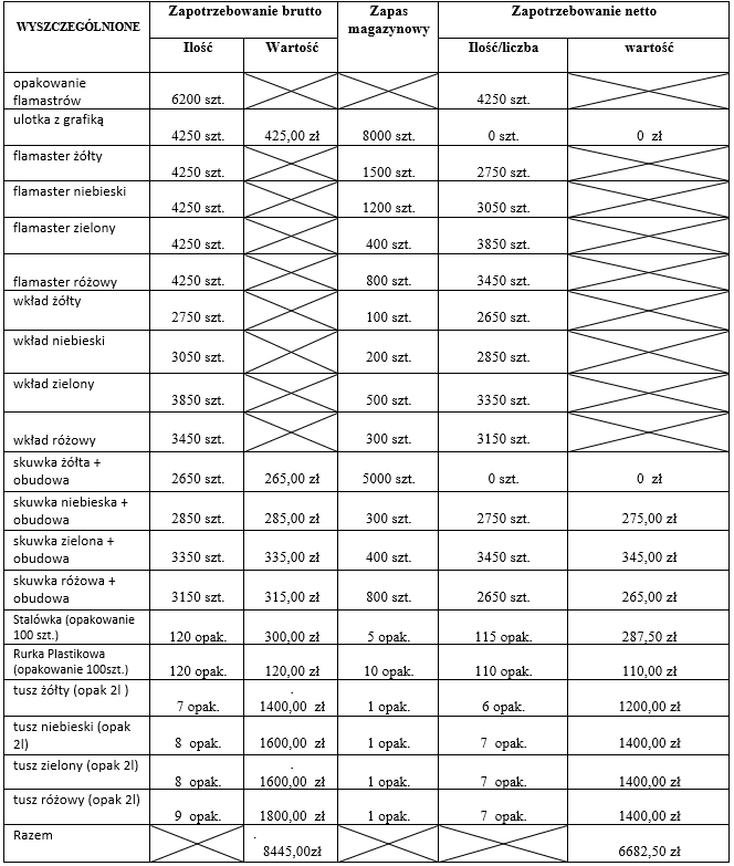 ZADANIE MRP – ILOŚCIOWO-WARTOŚCIOWE ZESTAWIENIE POTRZEB MATERIAŁOWYCH BRUTTO I NETTO